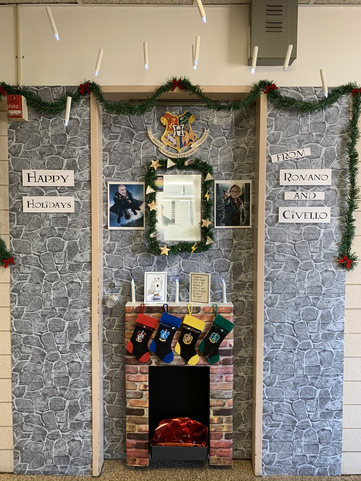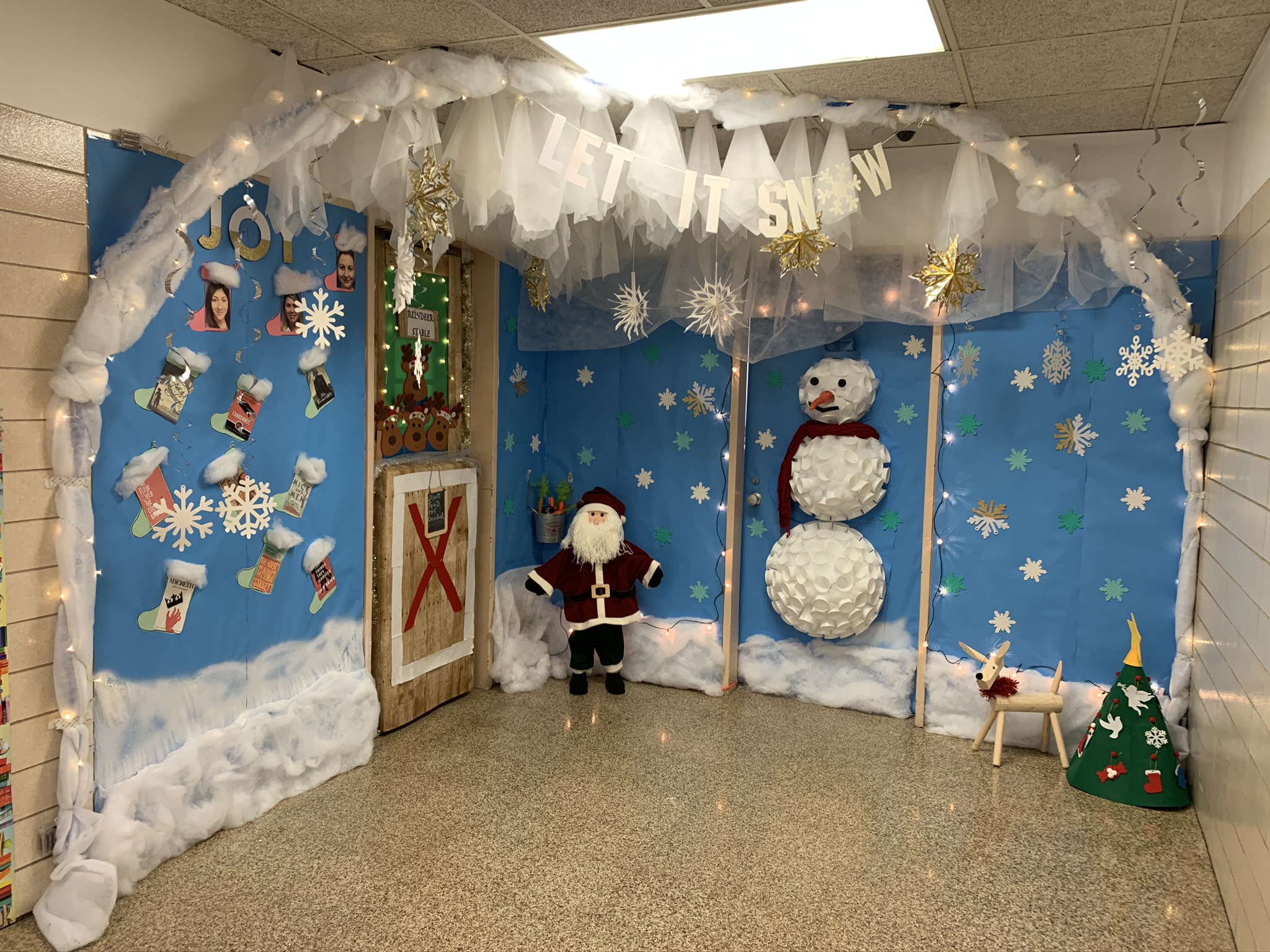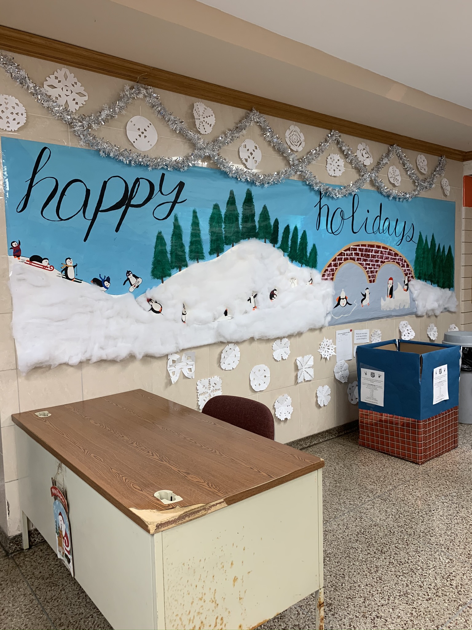 This December was the First Annual Door Decorating Contest at Hicksville High School. English teacher, Mr. Artie Mediate came up with the fantastic idea and the Director of Student Activities, Mrs. Angela Galante made it happen! Over 65 classroom doors participated in the contest and they were all phenomenal!! Ms. Temps and her Robotics team along with Ms. Hagedorn, Mr. Baio and the Equality Club also did a wonderful “Winter Wonderland” display in the lobby. The winner of the contest was room 323 decorated by Ms. Hurley, Ms. Pirozzi, and Ms. Shtein.