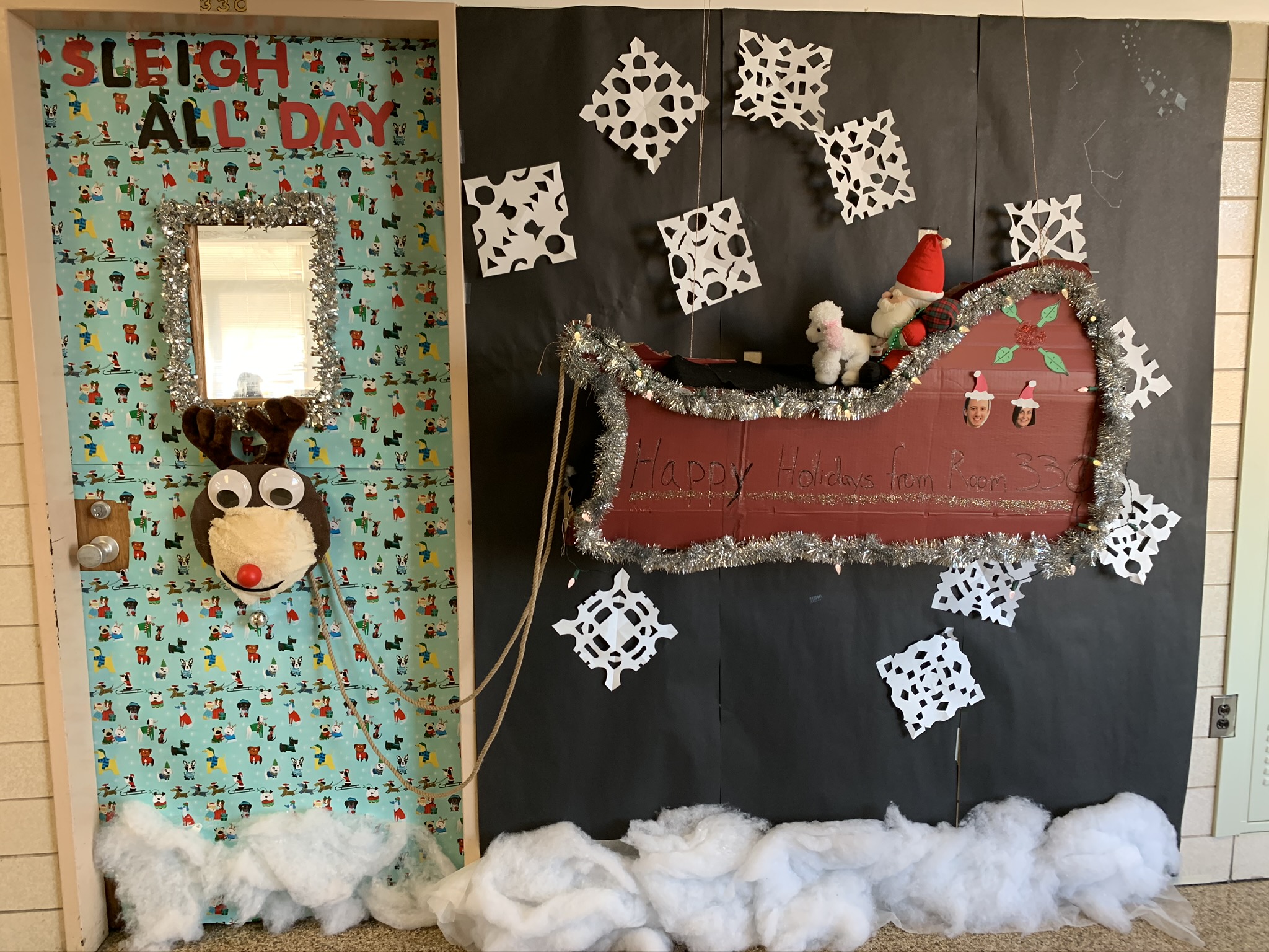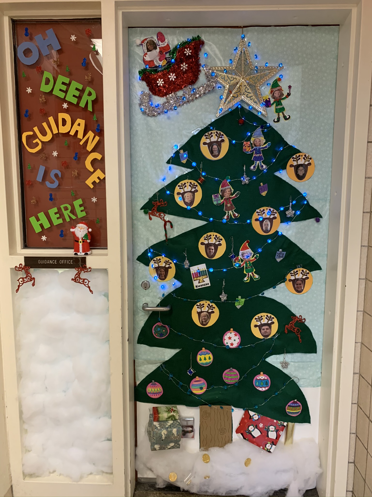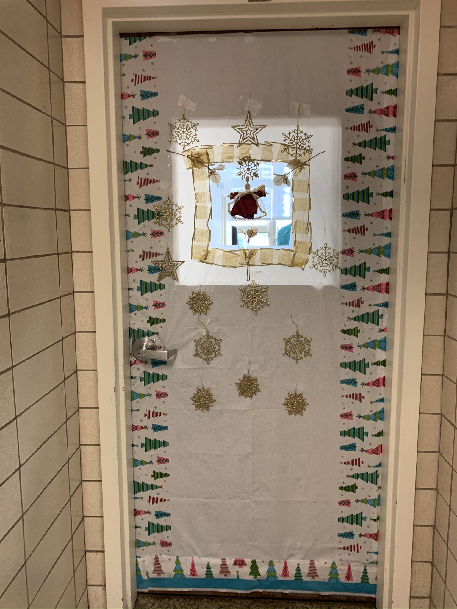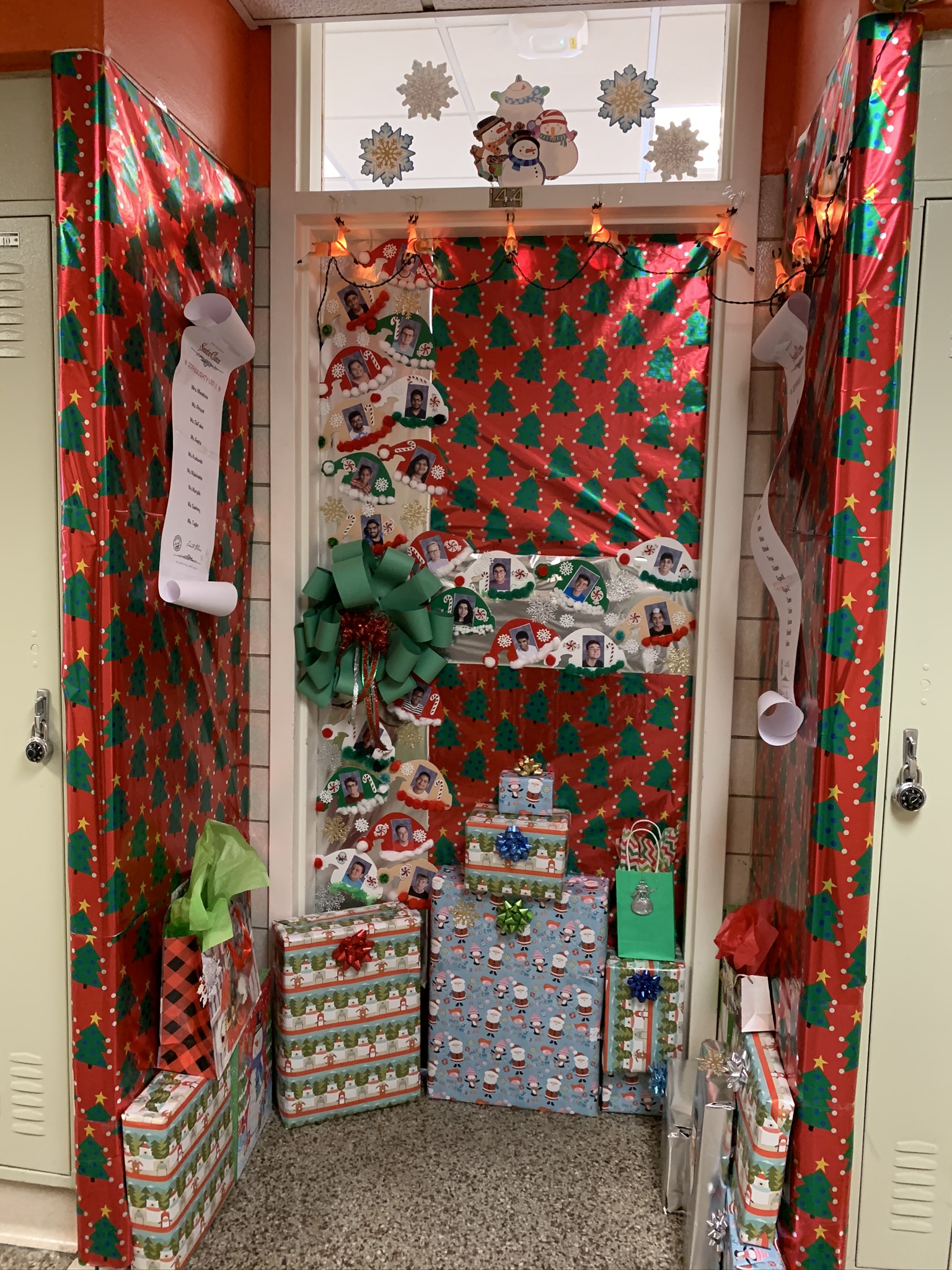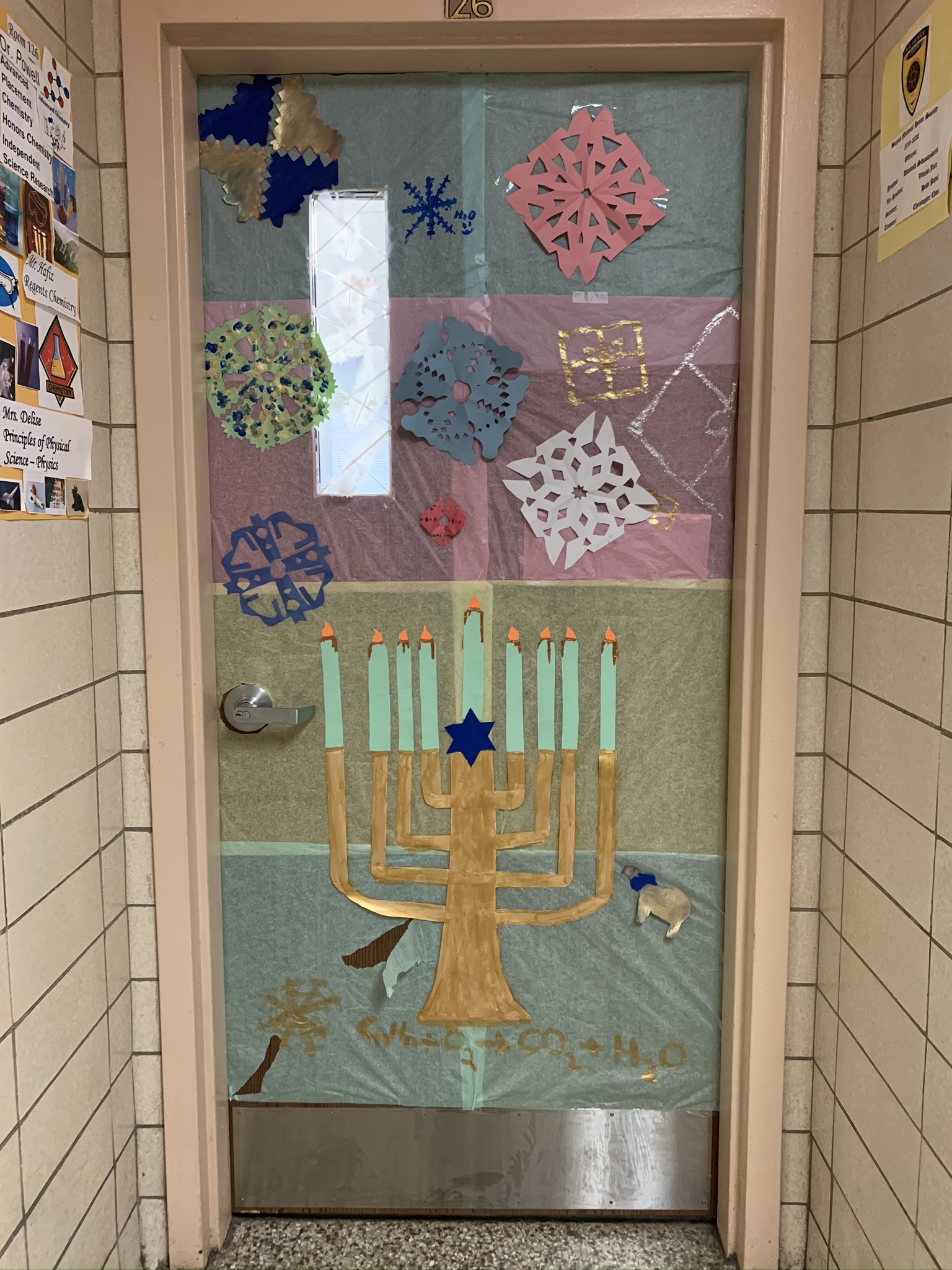 The door displayed a quilt held by a 3D reindeer. Each square of the quilt contained a quote submitted by each student stating how they celebrate their holiday and their individual traditions. Next year there will be a 1st, 2nd and 3rd place for each floor and hopefully 100% participation! The entire faculty, staff, and the students were excited to decorate the doors and the lobby and the holiday spirit was felt throughout the building!! We are looking forward to this tradition continuing in the high school for years to come!!