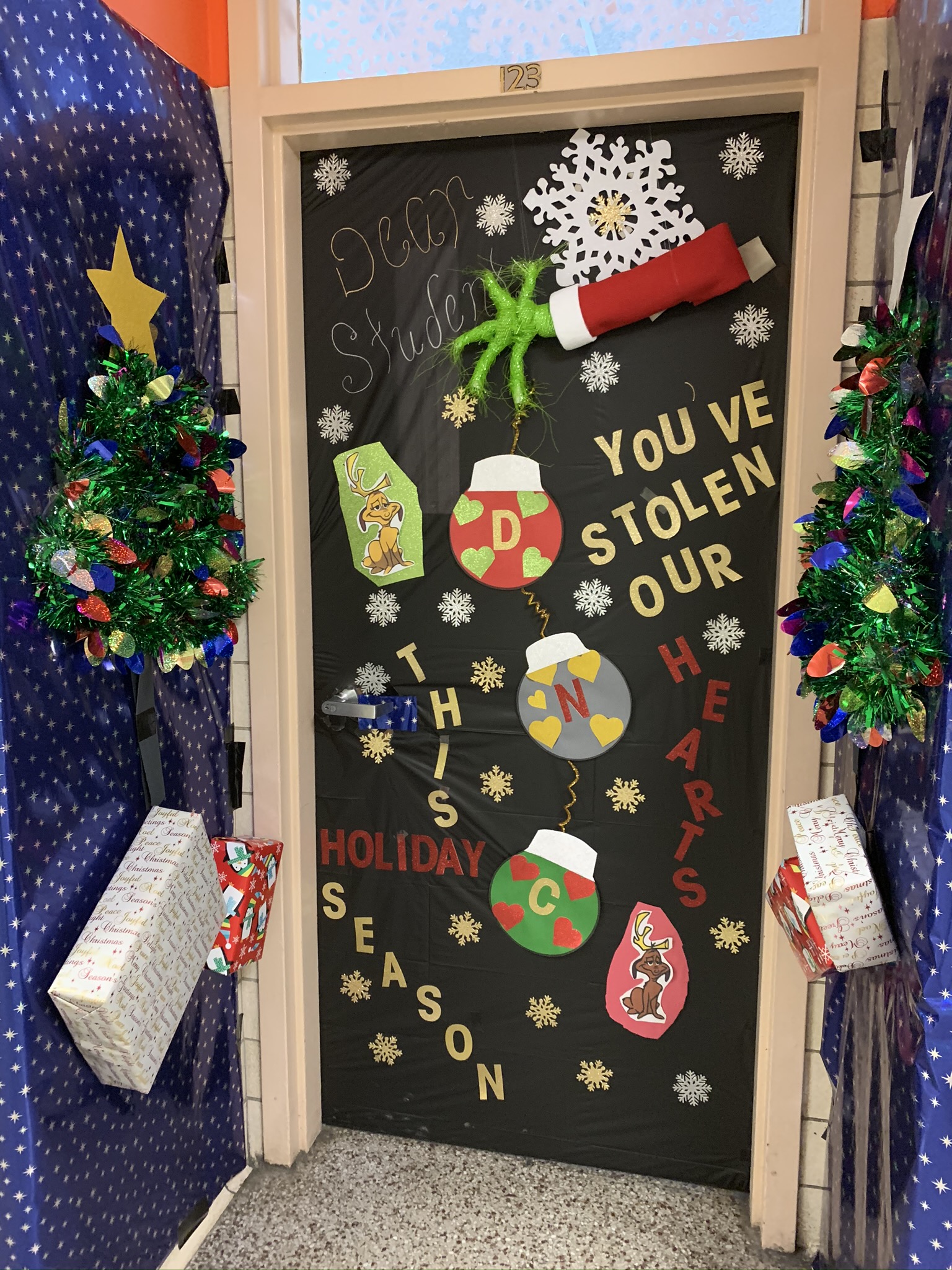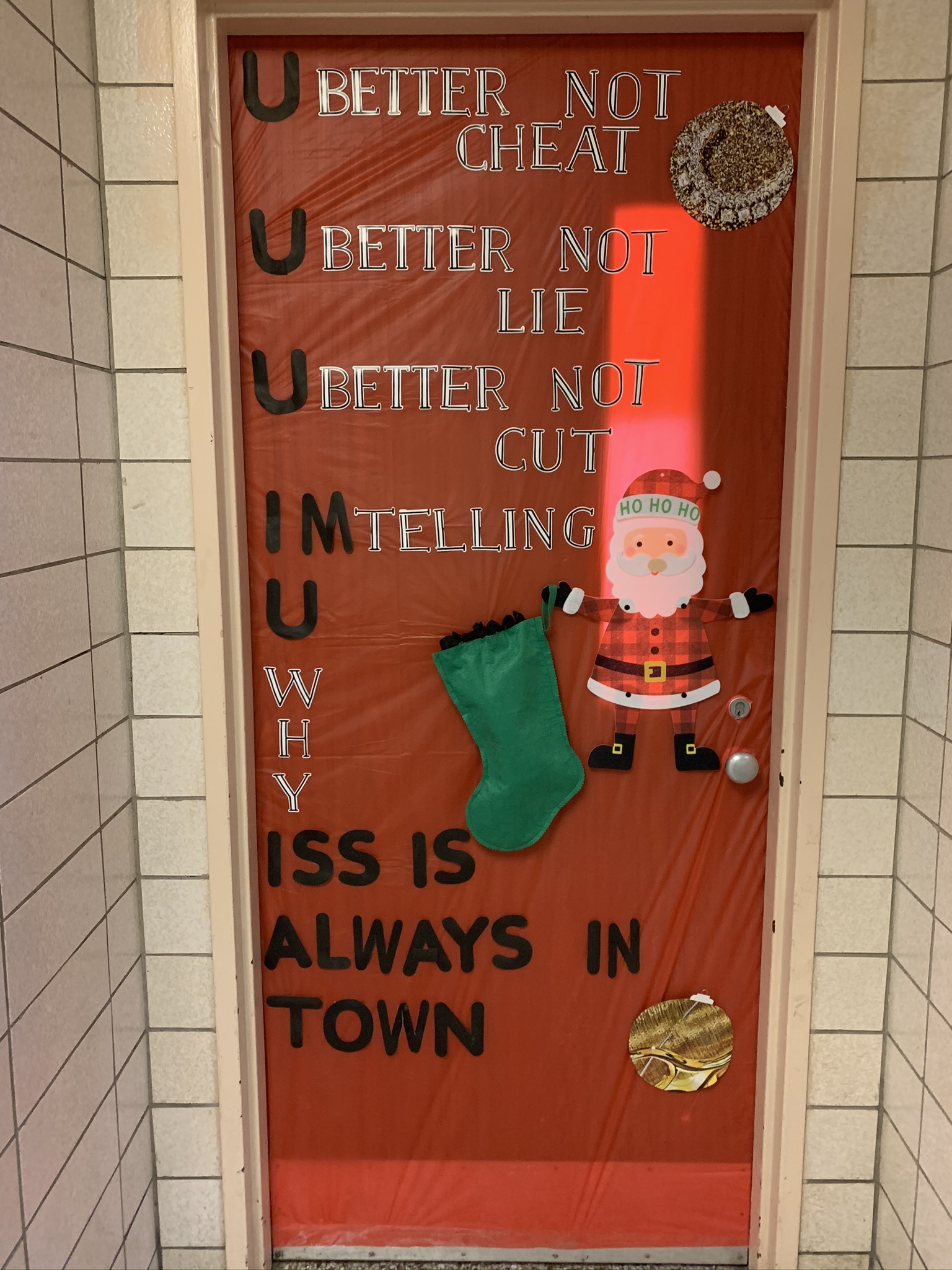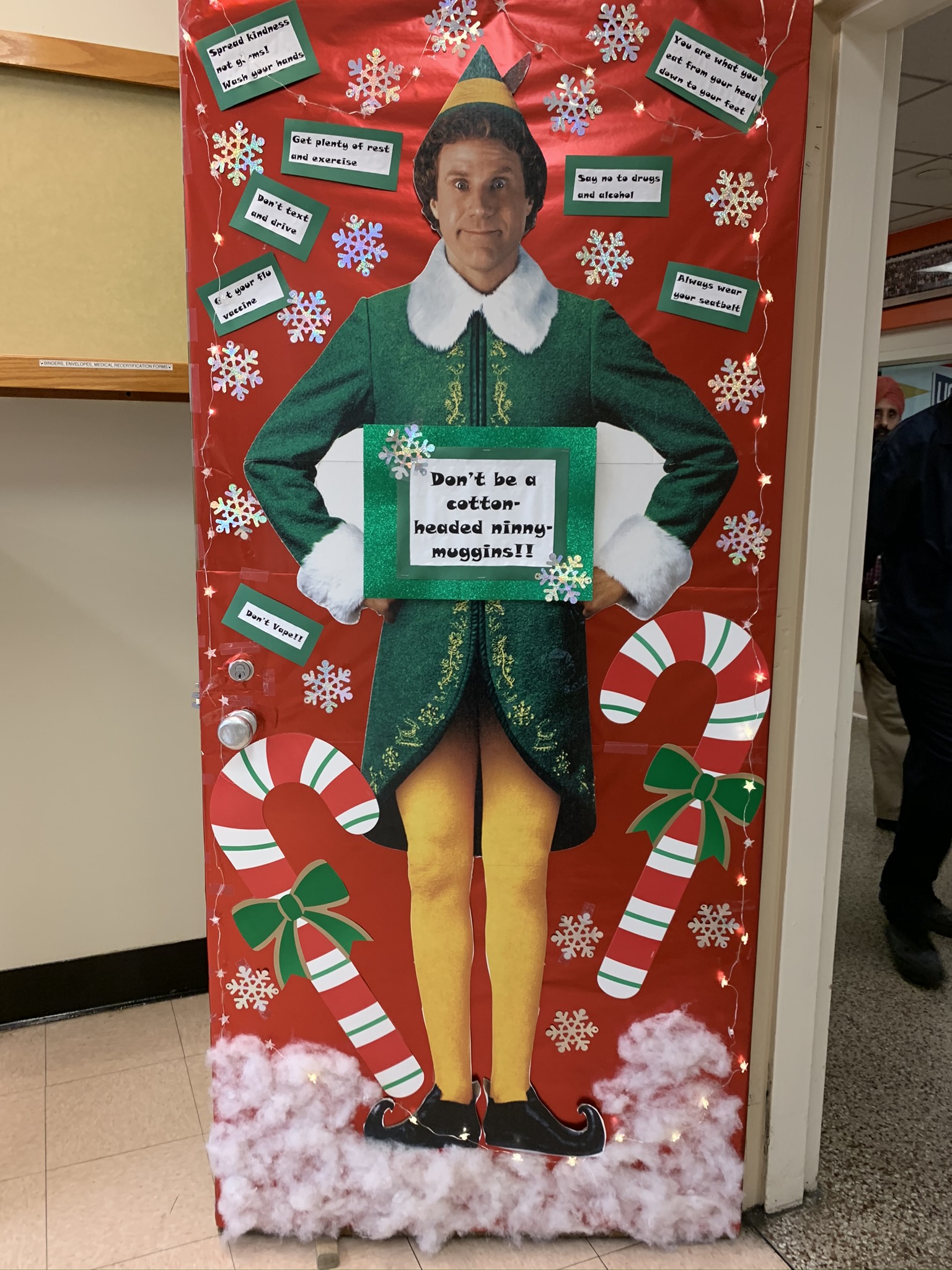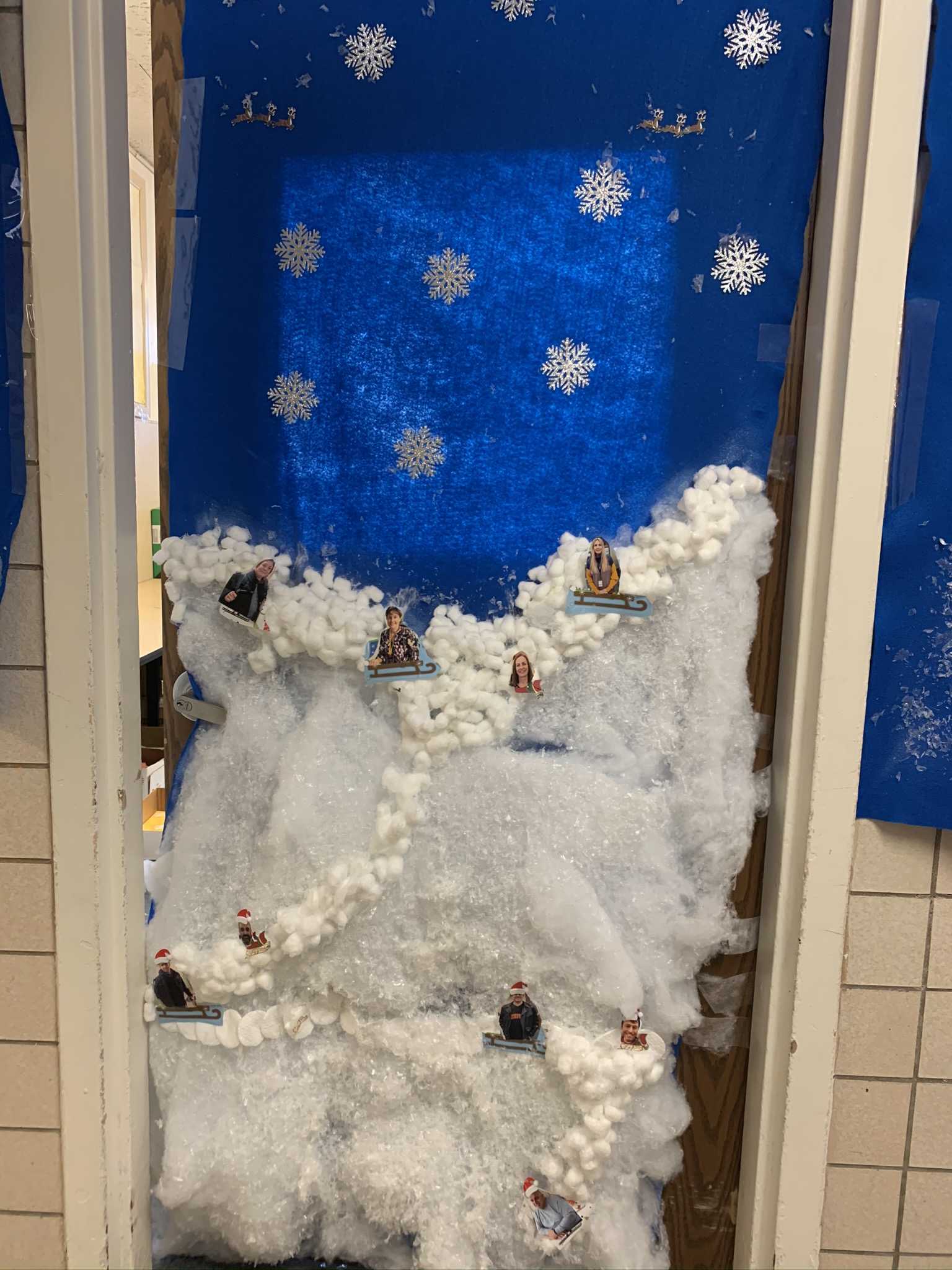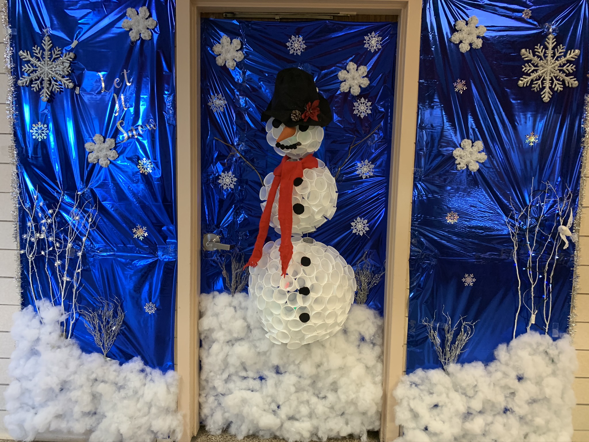 The door displayed a quilt held by a 3D reindeer. Each square of the quilt contained a quote submitted by each student stating how they celebrate their holiday and their individual traditions. Next year there will be a 1st, 2nd and 3rd place for each floor and hopefully 100% participation! The entire faculty, staff, and the students were excited to decorate the doors and the lobby and the holiday spirit was felt throughout the building!! We are looking forward to this tradition continuing in the high school for years to come!!