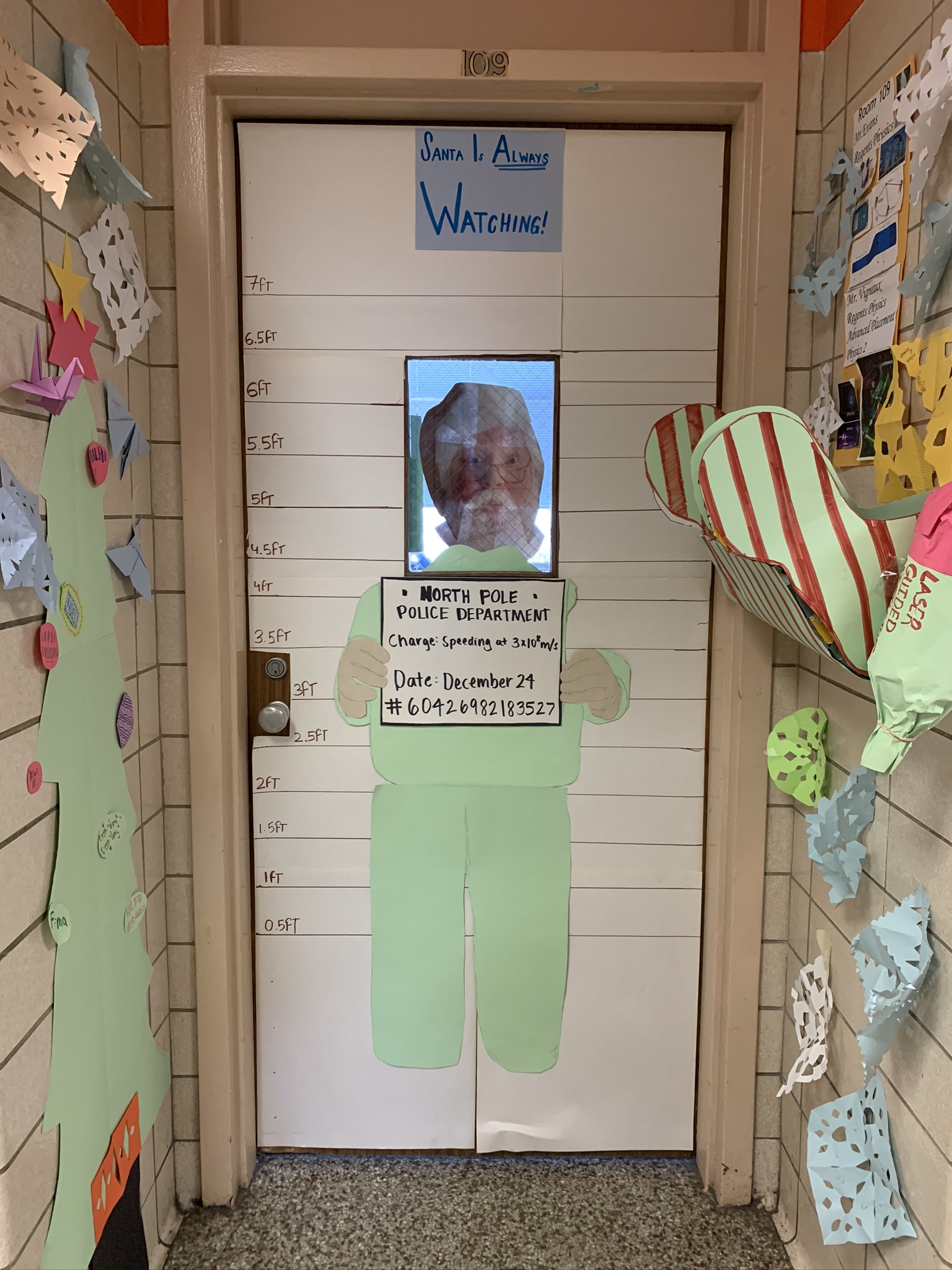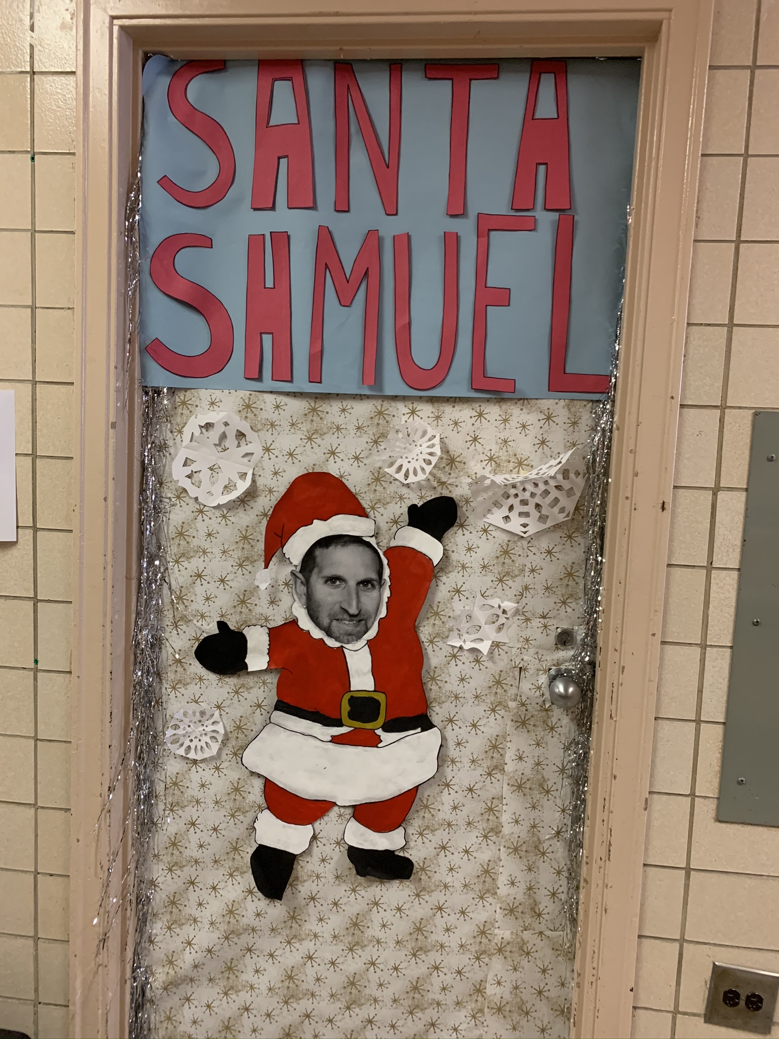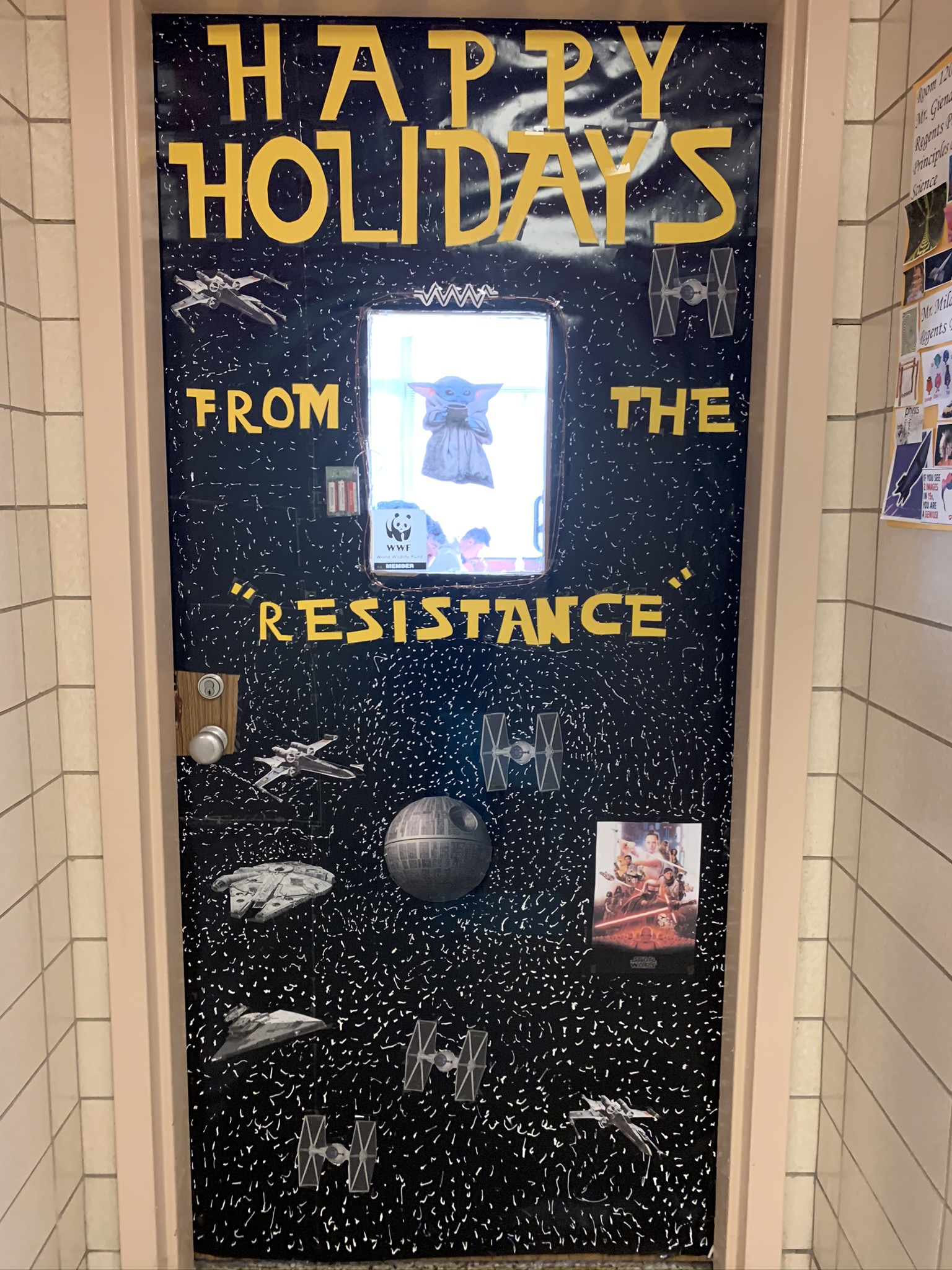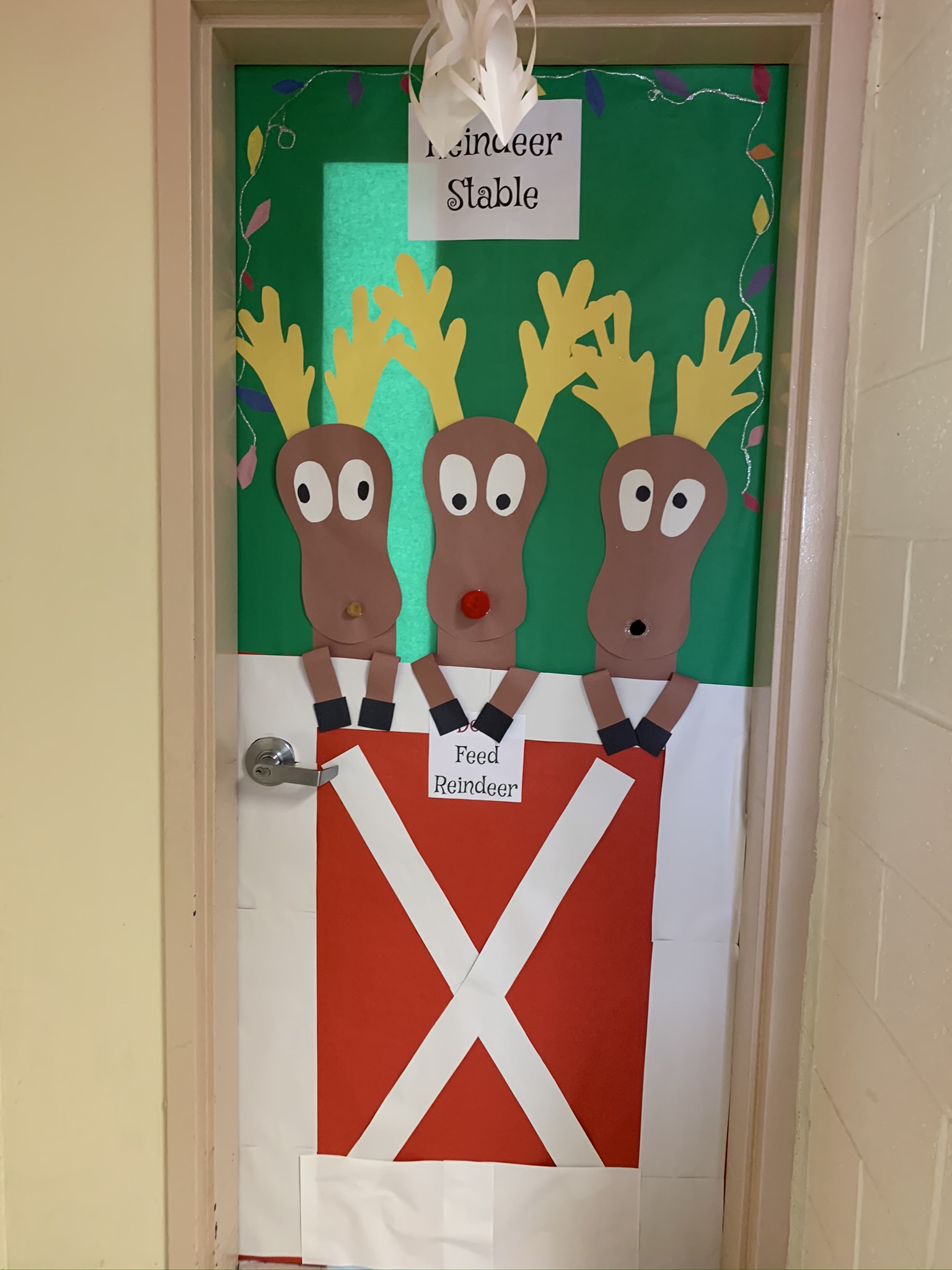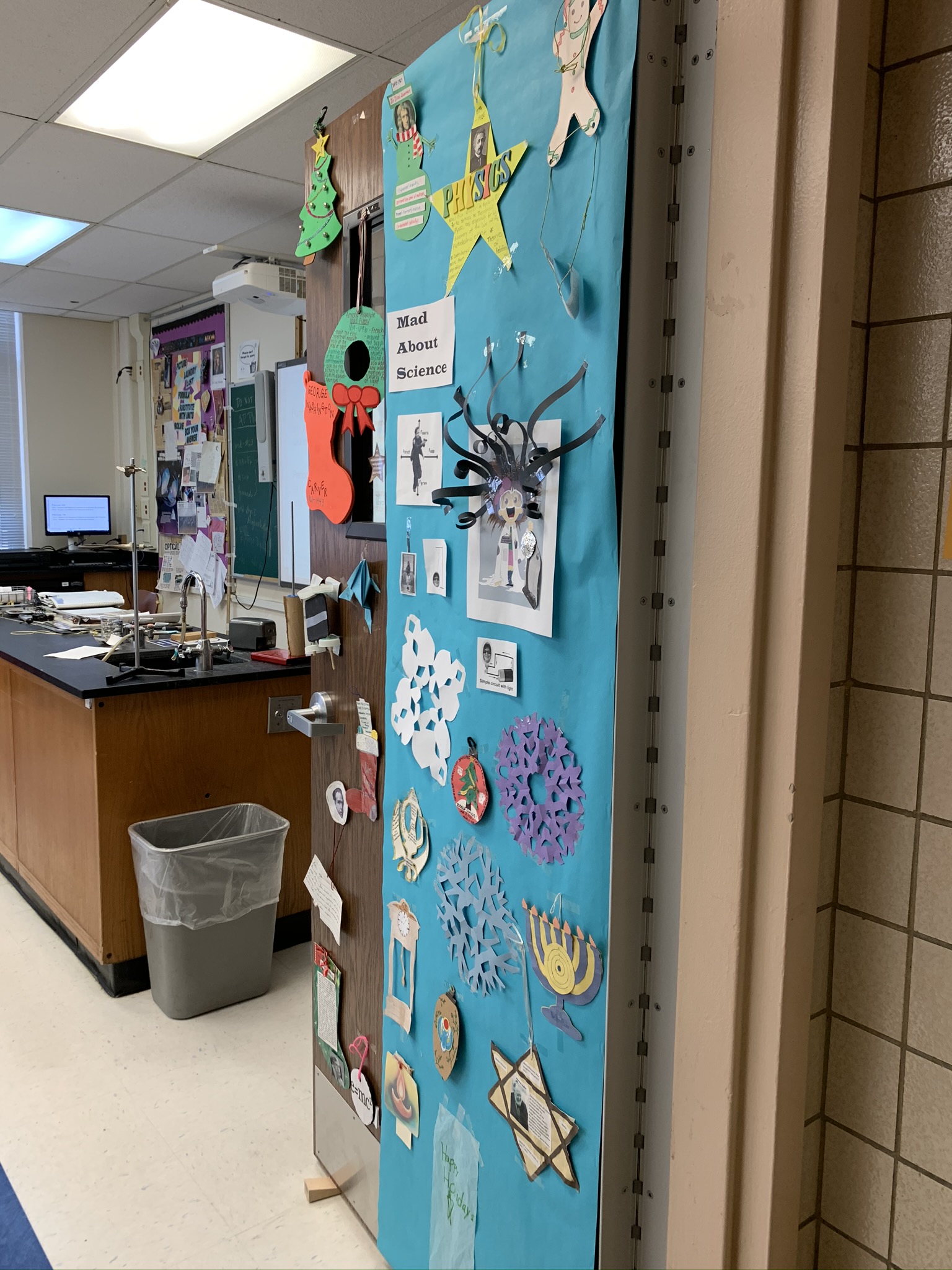The door displayed a quilt held by a 3D reindeer. Each square of the quilt contained a quote submitted by each student stating how they celebrate their holiday and their individual traditions. Next year there will be a 1st, 2nd and 3rd place for each floor and hopefully 100% participation! The entire faculty, staff, and the students were excited to decorate the doors and the lobby and the holiday spirit was felt throughout the building!! We are looking forward to this tradition continuing in the high school for years to come!!